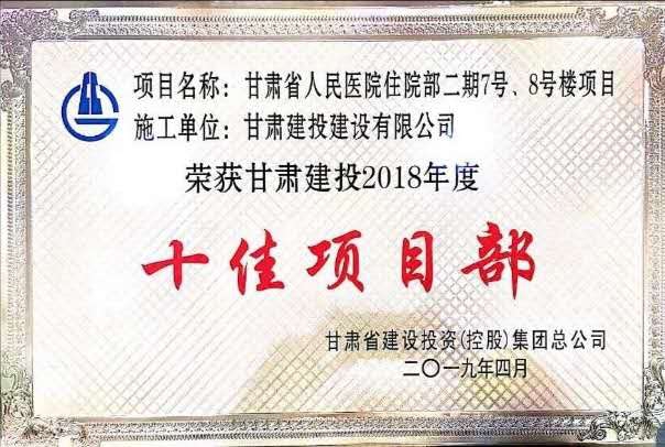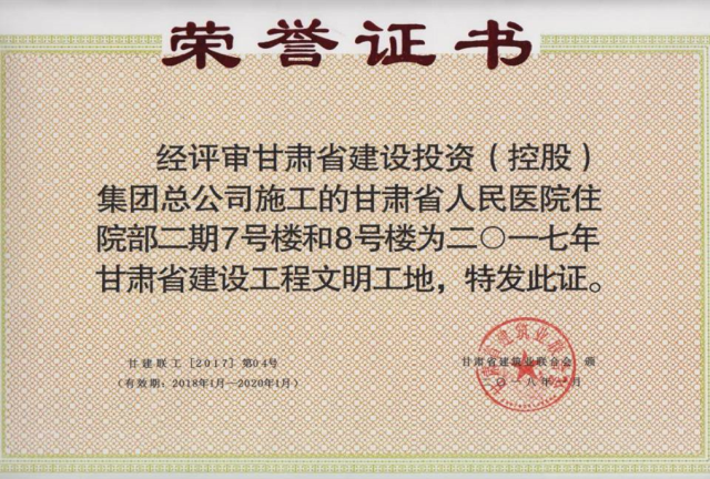 該項(xiàng)目自開工以來(lái),安全文明施工管理取得了一定的成效,接受了省安質(zhì)局、蘭州市城市管理行政執(zhí)法局、蘭州市環(huán)保局、蘭州市綜治辦、蘭州市建設(shè)局等政府主管部門及甘肅建投的多次檢查,均得到了好評(píng),曾一度被評(píng)為甘肅建投系統(tǒng)“安全文明施工”第一名,同時(shí),項(xiàng)目的安全文明施工成果也得到了建設(shè)單位、監(jiān)理單位以及社會(huì)各界的認(rèn)同和贊譽(yù)。在2017年,甘肅省人民醫(yī)院項(xiàng)目部被甘肅省建筑業(yè)聯(lián)合會(huì)評(píng)為甘肅省建設(shè)工程文明工地。2018年度甘肅省人民醫(yī)院住院部二期7號(hào)樓和8號(hào)樓項(xiàng)目被中國(guó)建筑業(yè)協(xié)會(huì)建筑安全分會(huì)評(píng)為2018年參加全國(guó)范圍組織學(xué)習(xí)交流的建設(shè)工程施工安全生產(chǎn)標(biāo)準(zhǔn)化工地。