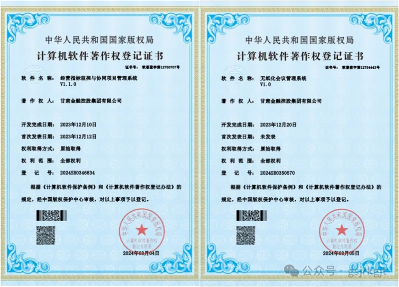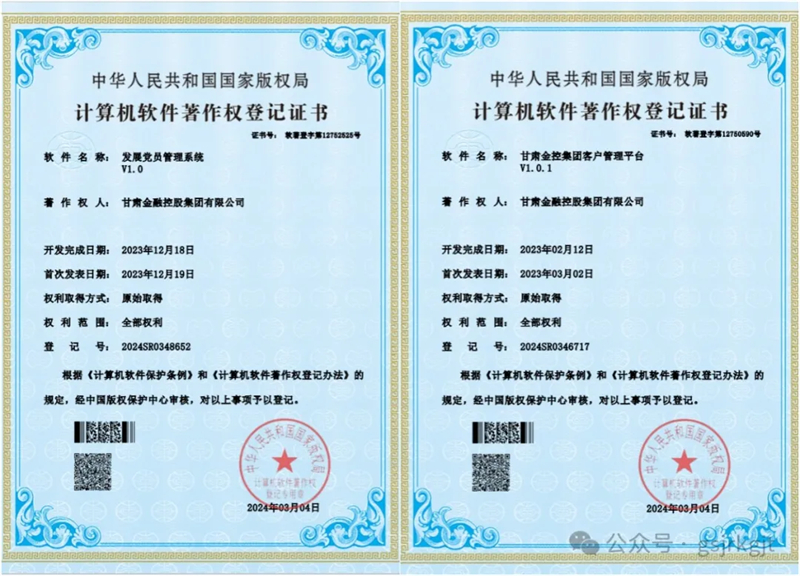 近日,甘肅金控集團獲得“無紙化會議管理系統”、“客戶管理平臺”、“經營指標監控與協同項目管理系統”和“發展黨員管理系統”四項計算機軟件著作權登記證書。本次獲得證書的軟件系統是集團在行政辦公、經營管理和黨建信息化建設方面的最新成果,標志著集團信息技術能力邁上新臺階。
