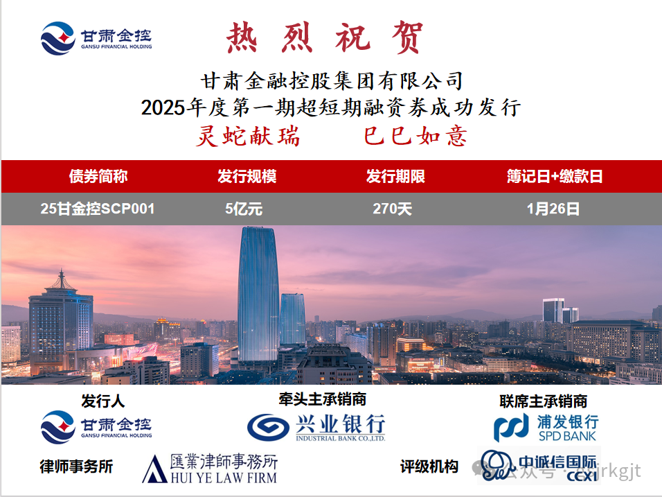 2025年1月26日,甘肅金控集團成功發(fā)行2025年度第一期超短期融資券,規(guī)模5億元,期限270天。本筆項目是乙巳蛇年春節(jié)前全國最后一筆公開發(fā)行債券,受到了交易商協(xié)會、北金所、市場投資人的特別關(guān)注,有力提高了集團的市場知名度,也為集團后續(xù)債券發(fā)行開了好頭!