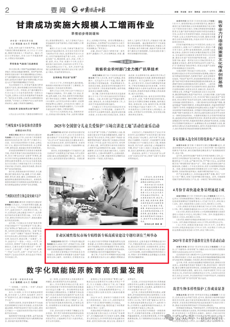 (新甘肅?甘肅經濟日報記者張莉莉)近日,由省工信廳、省財政廳主辦,甘肅股權交易中心承辦的甘肅區域性股權市場專精特新專板高質量建設專題培訓在蘭州舉辦。