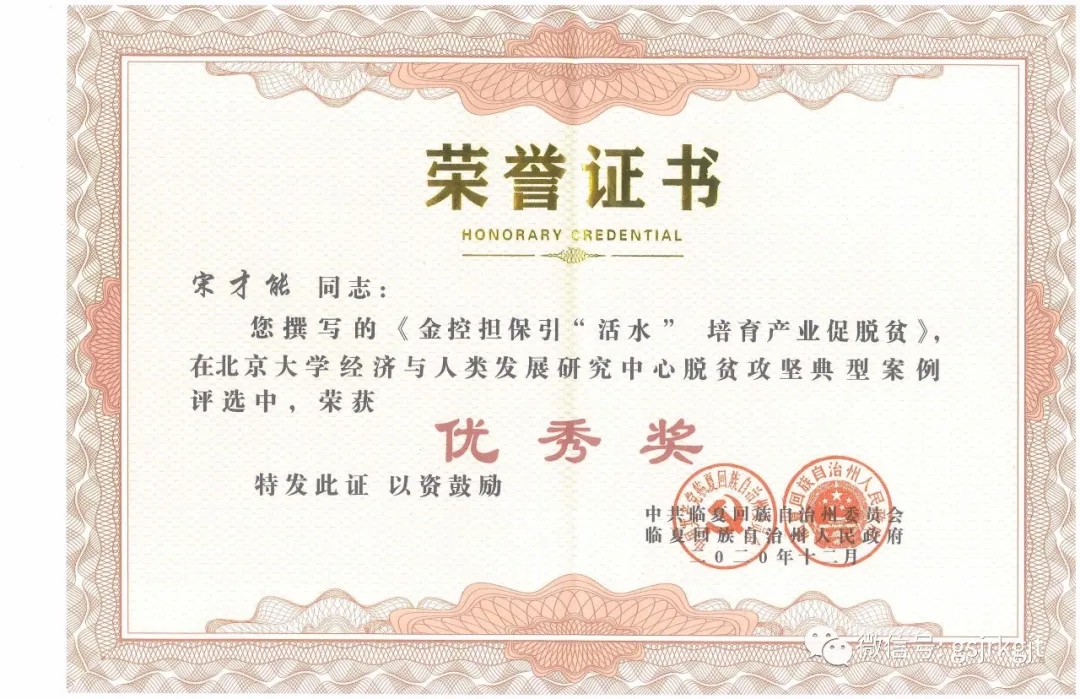 近期,臨夏州脫貧攻堅典型案例評選活動落下帷幕,金控臨夏擔保推薦的《金控擔保引活水,培育產業促脫貧》典型案例經北京大學課題組與臨夏州委宣傳部、州扶貧辦、州文聯、民族日報社多輪篩選評審,在北京大學經濟與人類社會發展研究中心脫貧攻堅典型案例評選中榮獲優秀獎,得到州委州政府表彰。