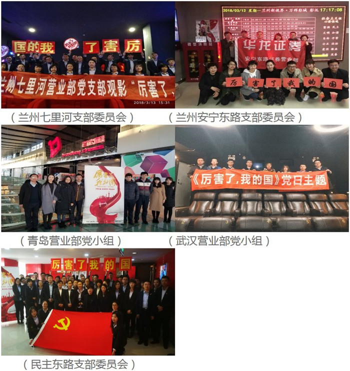 華龍證券股份有限公司黨委根據公司“兩學一做”學習教育制度和學習十九大精神系列活動計劃,認真安排部署,積極組織全體黨員、干部、員工開展《厲害了,我的國》主題黨日觀影活動,為每人購買2張影票,與家人朋友一同觀影。不僅豐富公司學習活動內容,提高精神素養,感受新時代祖國翻天覆地變化,同時傳遞正能量,增強企業凝聚力,激發昂揚斗志,鼓舞全體人員朝氣蓬勃邁向未來。
