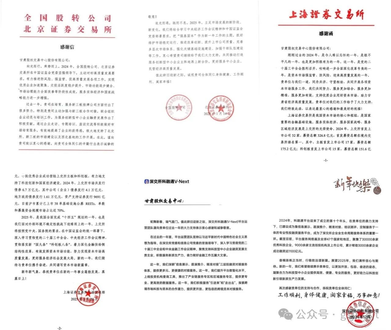 近日,甘肅股權交易中心收到北京證券交易所和全國股轉公司、上海證券交易所、深圳證券信息有限公司感謝信,對甘肅股權交易中心過去一年給予的支持表示感謝,同時希望未來進一步加強合作交流,凝聚合力服務實體經濟高質量發展。